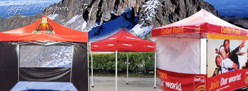 Gazebos, marquees and tents are stylized outer covering often placed in open spaces The are made from Flex material or Heavy Duty Canvas ( Water proof) the Size is Made to meet customer specifications and design.