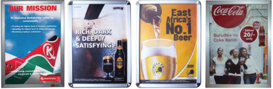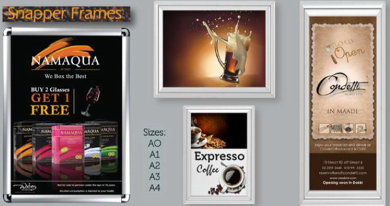 A Snapper Frame is a lightweight aluminium frame used to display posters. Its Ideal for brand message display , Flexible messaging and Up close branding Materials used is Aluminium 20mm or 30mm (depth), Aluminium - weather resistant & corrosion free, 25mm snap frame aluminium profile. There is a piece of PVC film 0.35mm thickness for the cover to protect the poster from breaking, There are three metal hooks on the back for hanging and 1.5mm gray PS board for the bottom board. The Size is up to Up to A0 size