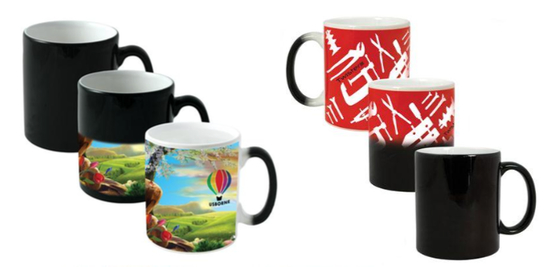 Color Changing and Novelty Mugs: If you're in the mood to do something different or just want to give a valued client a pleasant surprise, then these are the perfect mugs for you. Also known as magic mugs, the thing that sets these apart is that one moment they're plain black, and the next, once you've simply added a hot beverage and the mug begins to warm, your company's logo appears on a white background! If you have any questions please feel free to contact us.